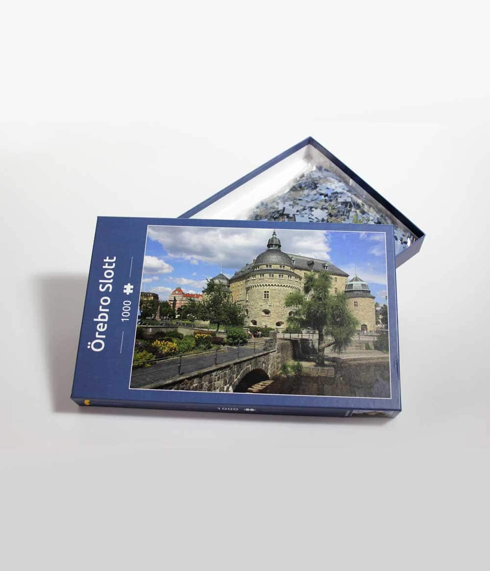 Ett 1000 bitars pussel med bild på vackra Örebro Slott.