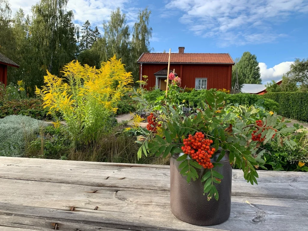 Vi hade vår hund med vilken välkomnades i trädgården. Dagen bjöd på sol och skön sensommarvärmen och i den här miljön har man inget emot att sitta ute.